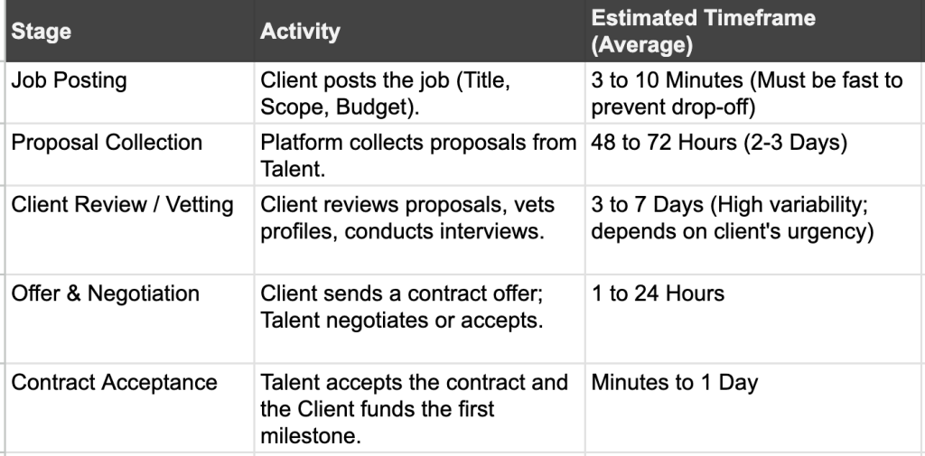 Estimating the time spent on the Upwork “Client-to-Work” flow involves two distinct phases with very different timelines: Pre-Hire Time and In-Contract Time.